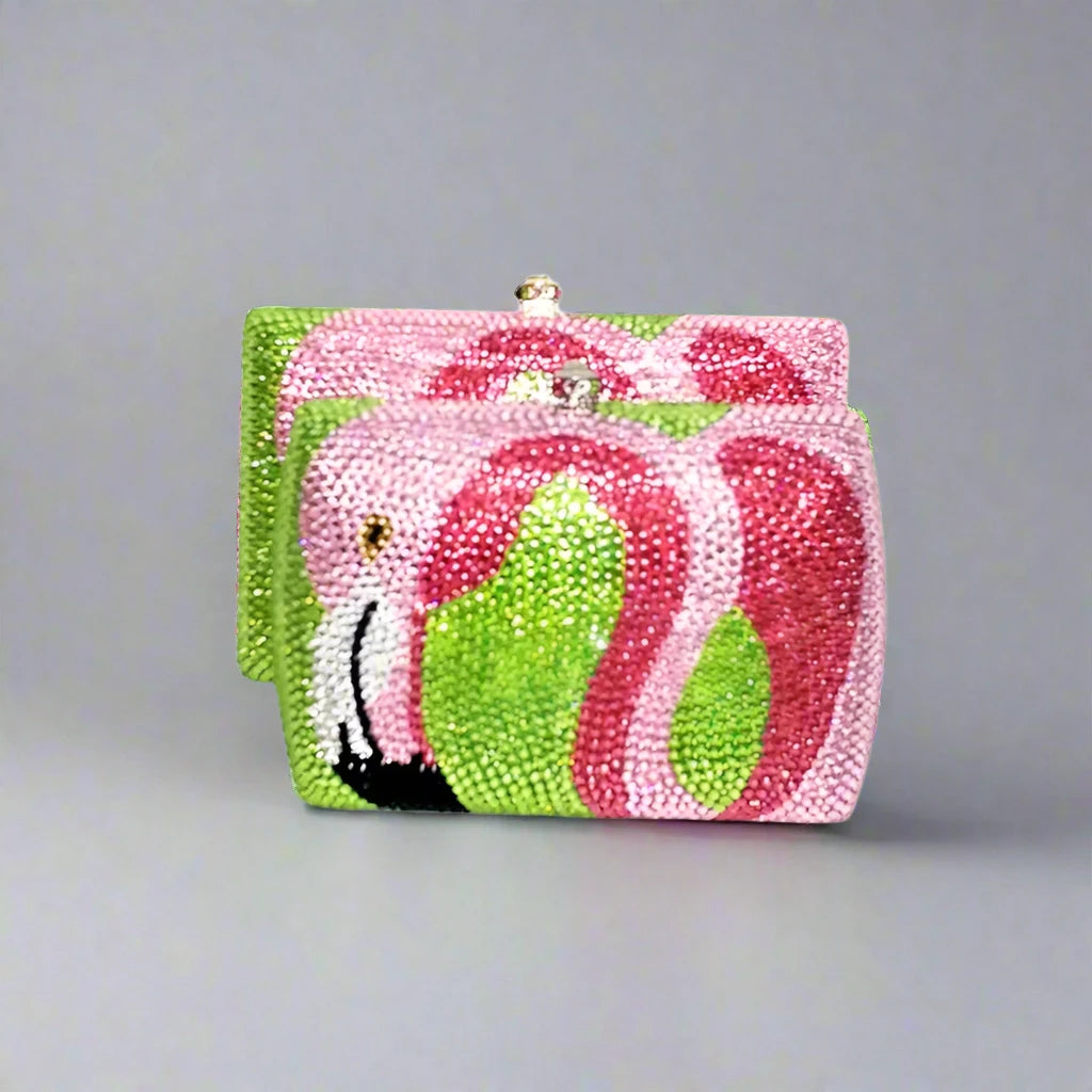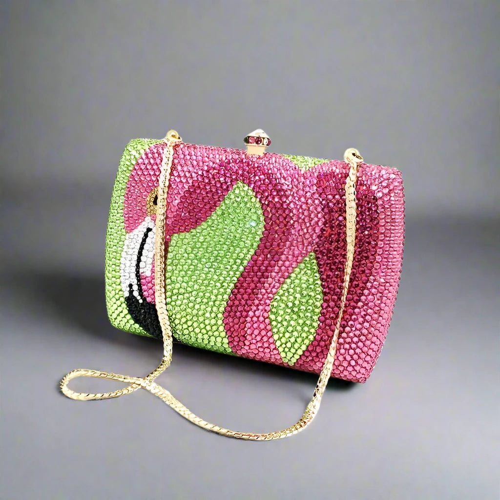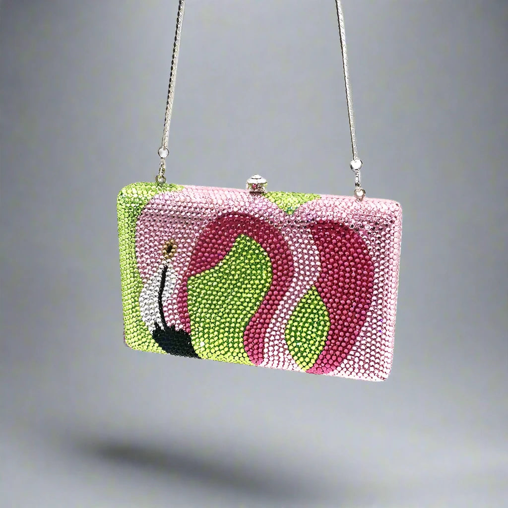 Make a bold statement with the Flamingo Dazzle, a stunning crystal clutch featuring a charming pink flamingo design adorned with sparkling silver and green crystals. This dazzling accessory comes with a sleek silver chain, perfect for adding a touch of whimsical glamour to any outfit. Compact yet eye-catching, the Flamingo Dazzle clutch is ideal for evening events, celebrations, or whenever you want to embrace a playful yet sophisticated vibe. It’s not just an accessory; it’s an unforgettable conversation piece.