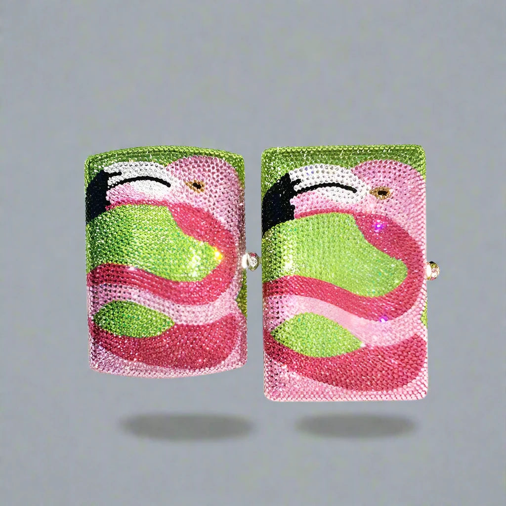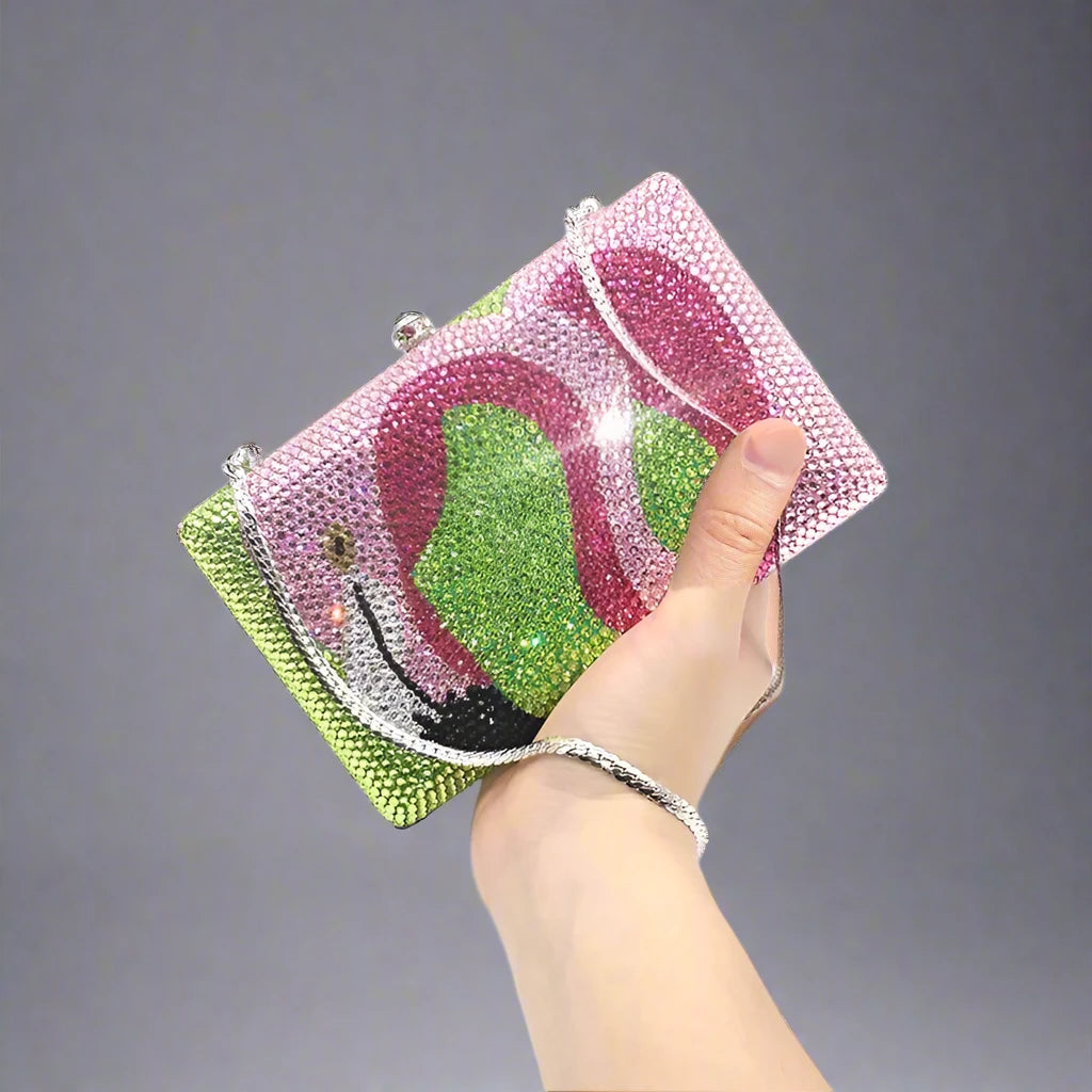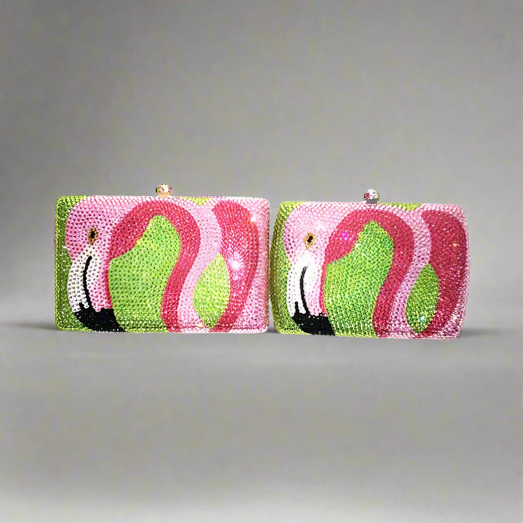 Make a bold statement with the Flamingo Dazzle, a stunning crystal clutch featuring a charming pink flamingo design adorned with sparkling silver and green crystals. This dazzling accessory comes with a sleek silver chain, perfect for adding a touch of whimsical glamour to any outfit. Compact yet eye-catching, the Flamingo Dazzle clutch is ideal for evening events, celebrations, or whenever you want to embrace a playful yet sophisticated vibe. It’s not just an accessory; it’s an unforgettable conversation piece.