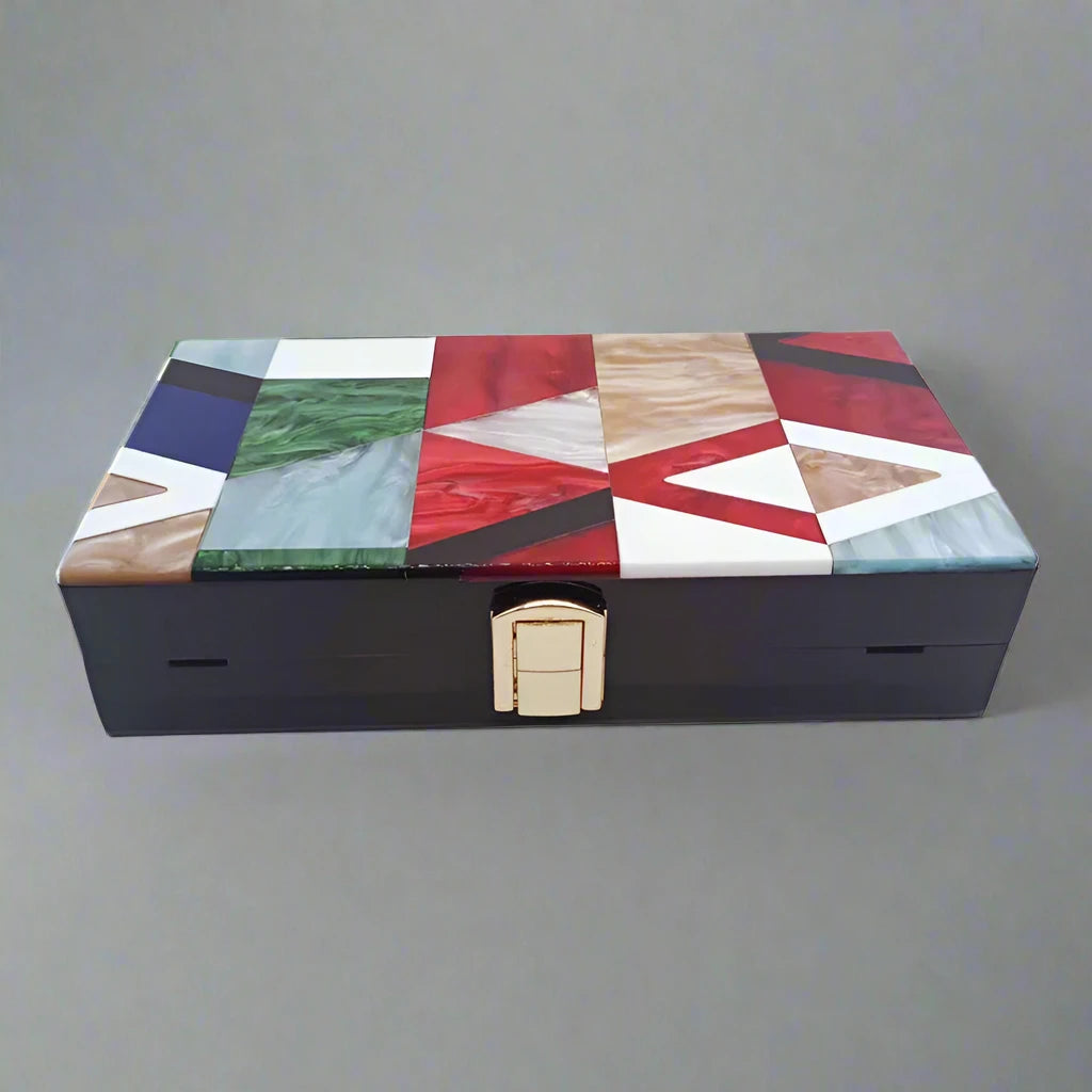 Illuminate any ensemble with the Aurora Glimmer, an exquisite acrylic clutch that radiates elegance with its rich, glimmering hues and sleek geometric design. Finished with a luxe gold chain, this clutch is the perfect blend of sophistication and modern edge, adding a hint of glam to evening outings or special events. Its compact yet spacious interior is perfect for essentials, keeping you effortlessly stylish wherever the night takes you.